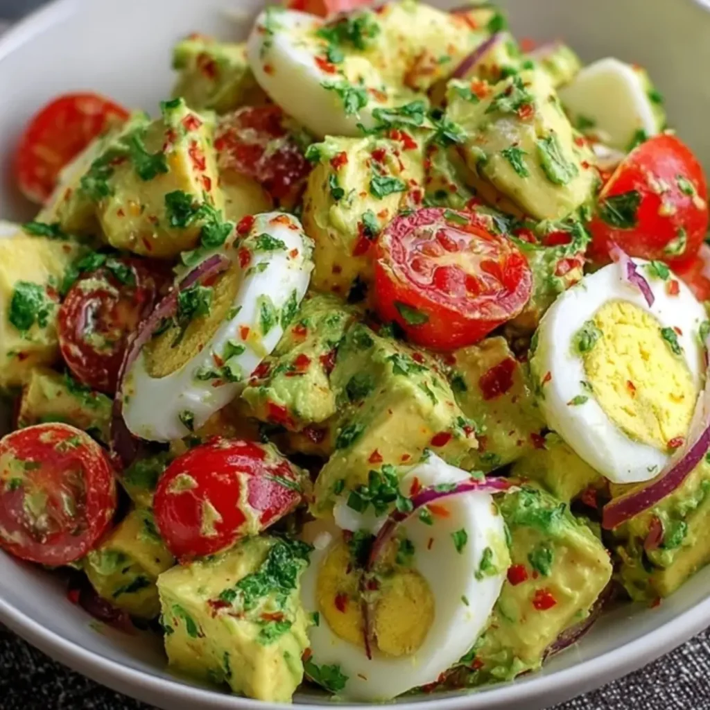 In a large mixing bowl, gently toss together your chopped hard-boiled eggs, the creamy diced avocados, the bright cherry tomato halves, and the finely chopped red onion.