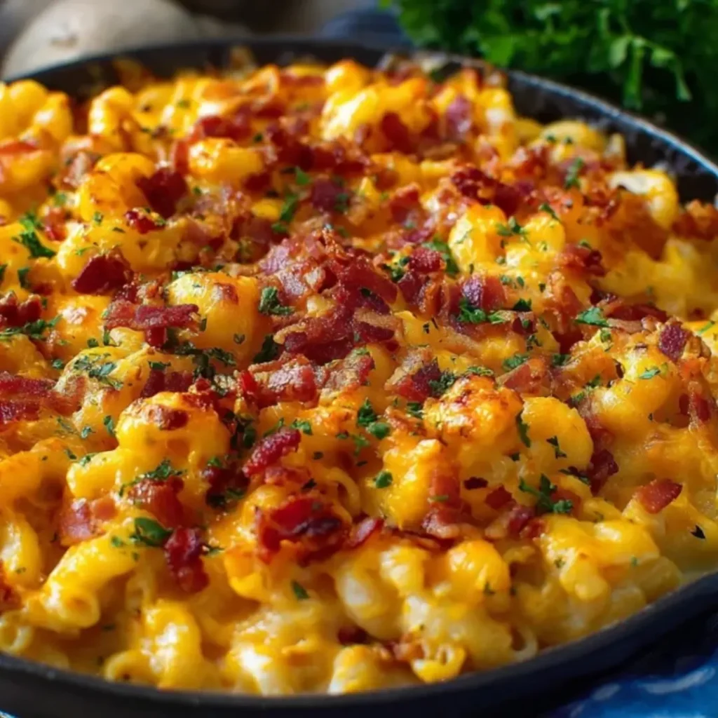 A close-up of creamy bacon mac and cheese in a dark skillet, topped with crispy bacon crumbles and fresh parsley.