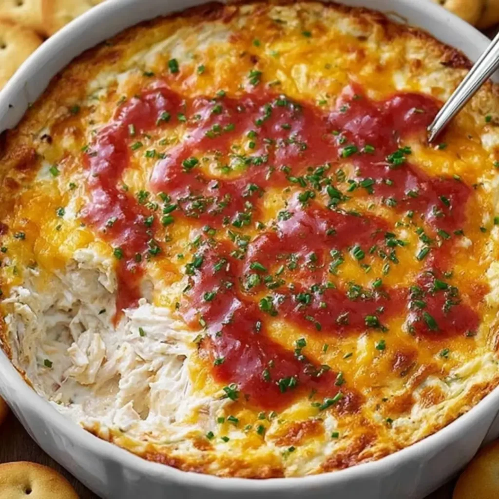 Creamy, hot, and bubbly baked crab dip topped with a light drizzle of red sauce (possibly hot sauce or cocktail sauce) and fresh parsley, served in a white baking dish surrounded by Ritz crackers.