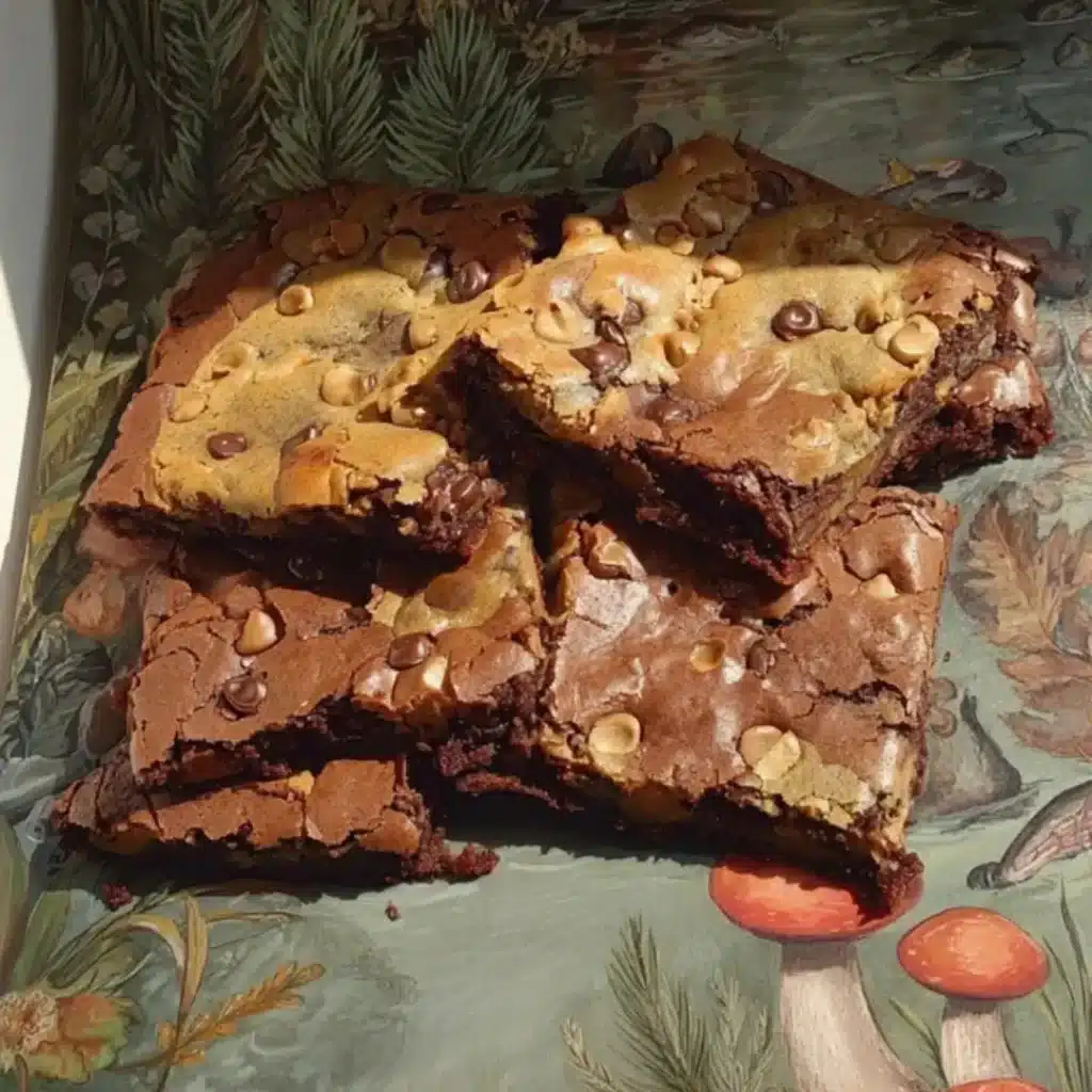 Stacked squares of Brookies (brownie and cookie hybrid bars) showing the rich, fudgy chocolate layer beneath the golden brown chocolate chip cookie layer.
