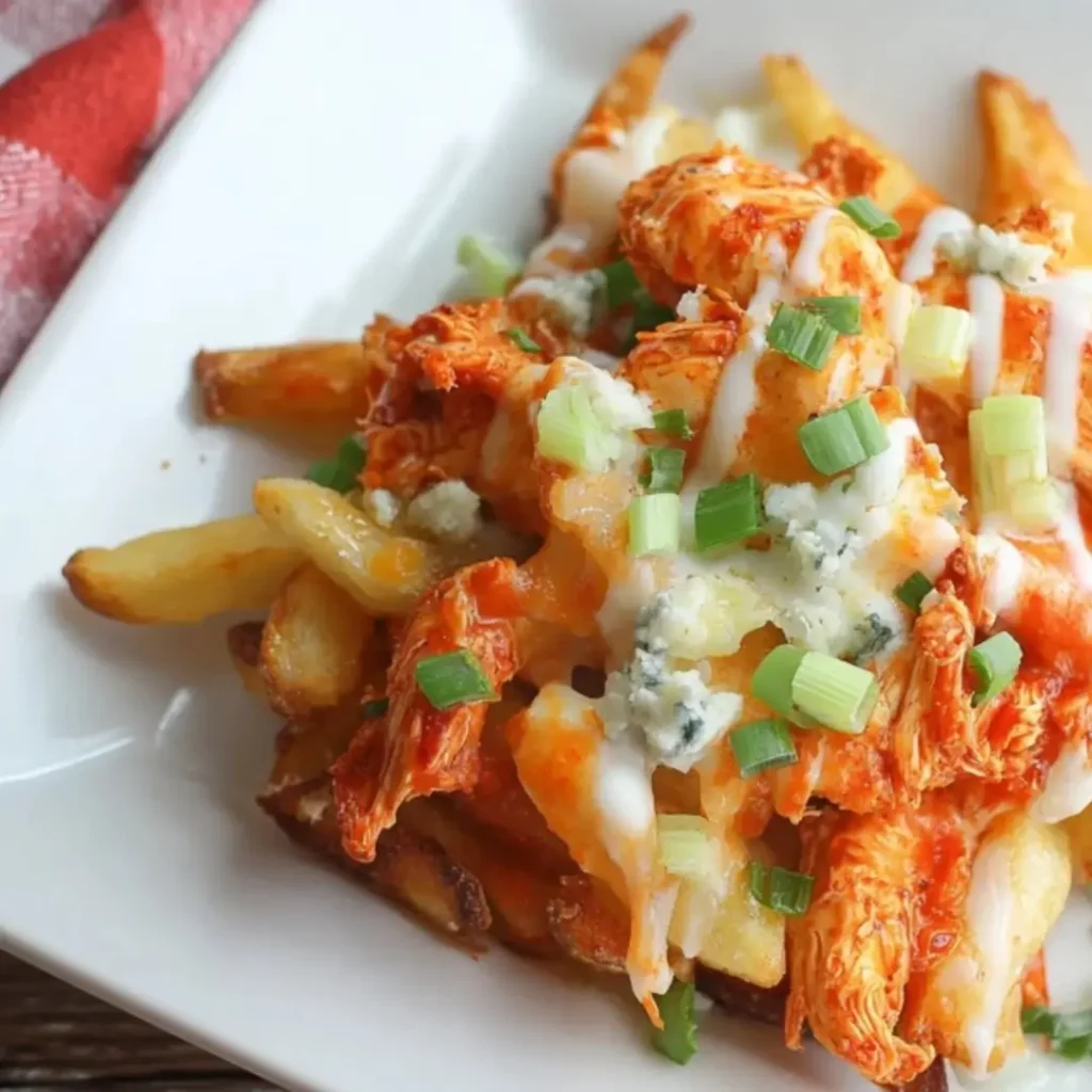 Crispy homemade fries loaded with spicy buffalo chicken, melty cheese, and cool ranch—an irresistible comfort-food combo!