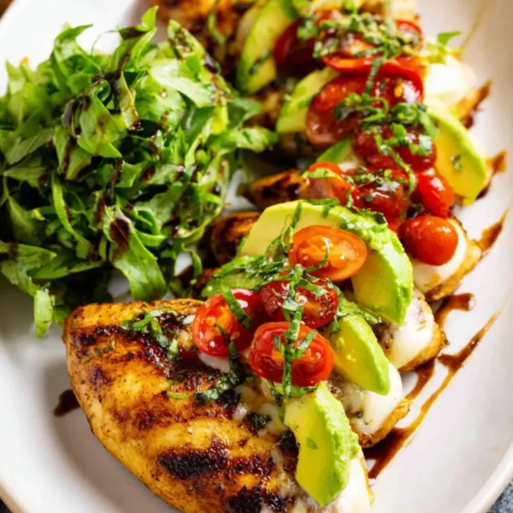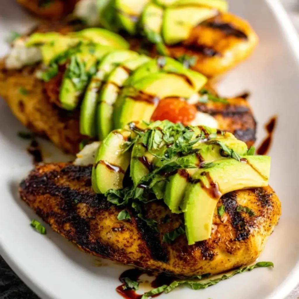 Grilled {{ $('Fetch Recipe Data').first().json["Main Keyword"] }} topped with melted mozzarella, fresh avocado, and balsamic.