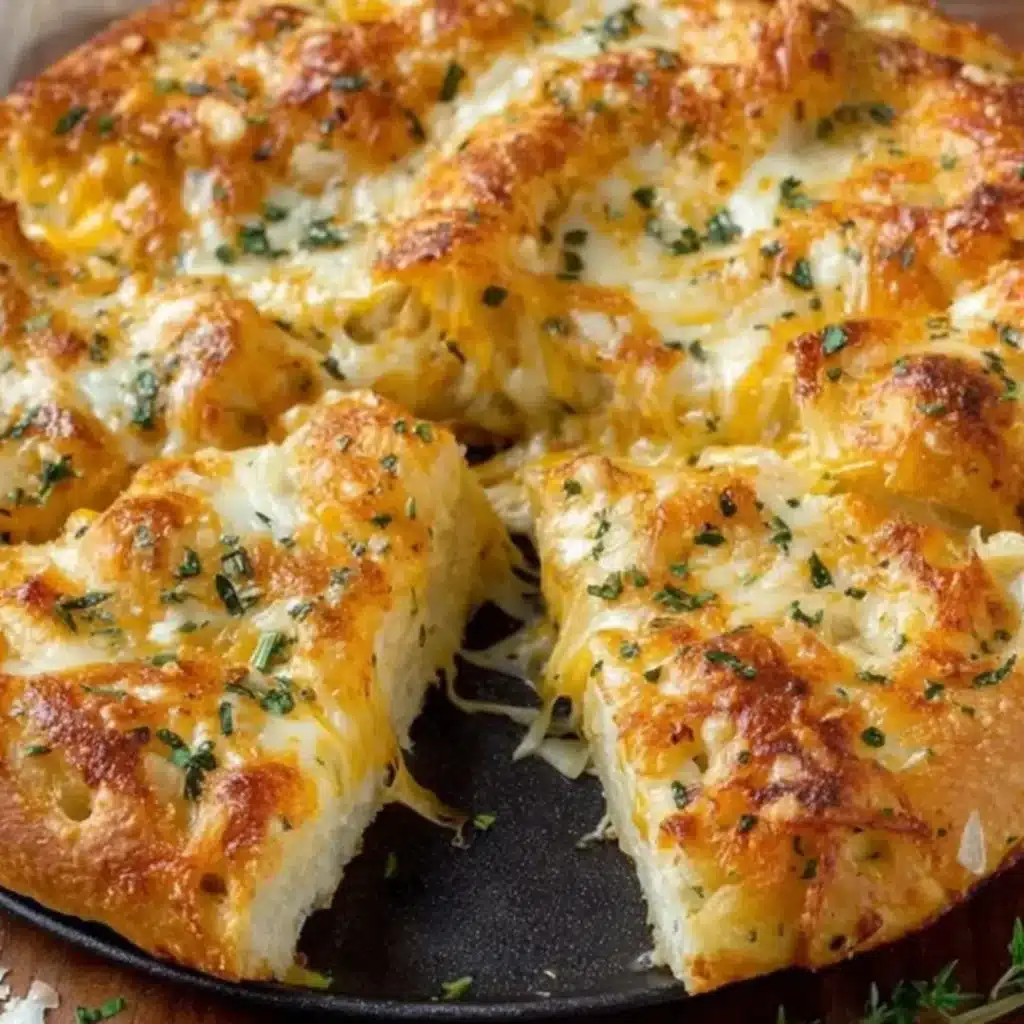 A soft, fluffy focaccia loaded with garlic, melted cheeses, and herbs — the perfect comforting homemade bread.