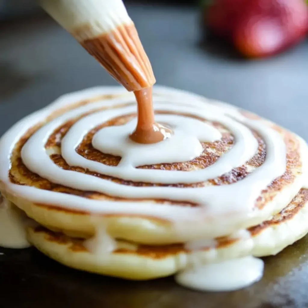 While the pancakes are warm (or even as they cool slightly), quickly whisk together your softened cream cheese, melted butter, powdered sugar, and vanilla. Add the milk one tablespoon at a time until the glaze reaches a perfectly smooth, pourable consistency—it should drizzle beautifully, not run everywhere.