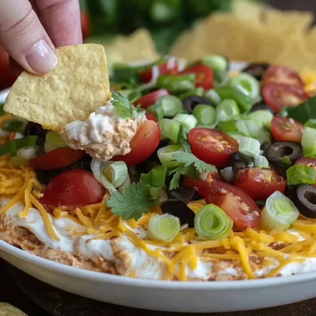 4. Can I add meat to this dip? Definitely! If you want to boost the protein even more, feel free to add a layer of seasoned, browned ground turkey or beef right on top of the creamy base before adding the veggies.