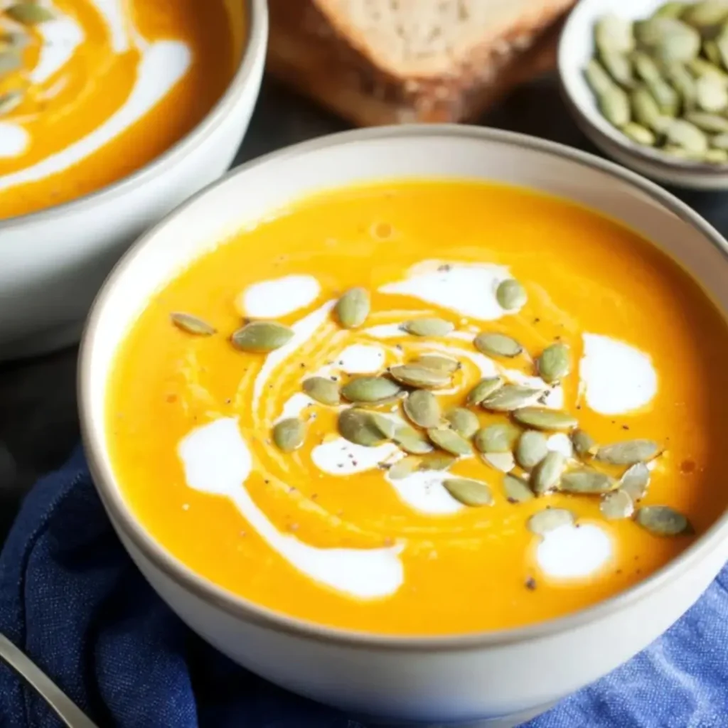 Ladle the hot soup into bowls. For an inviting finish, sprinkle each serving with crunchy roasted pumpkin seeds and swirl a tiny bit of cream or coconut milk on top. Enjoy!