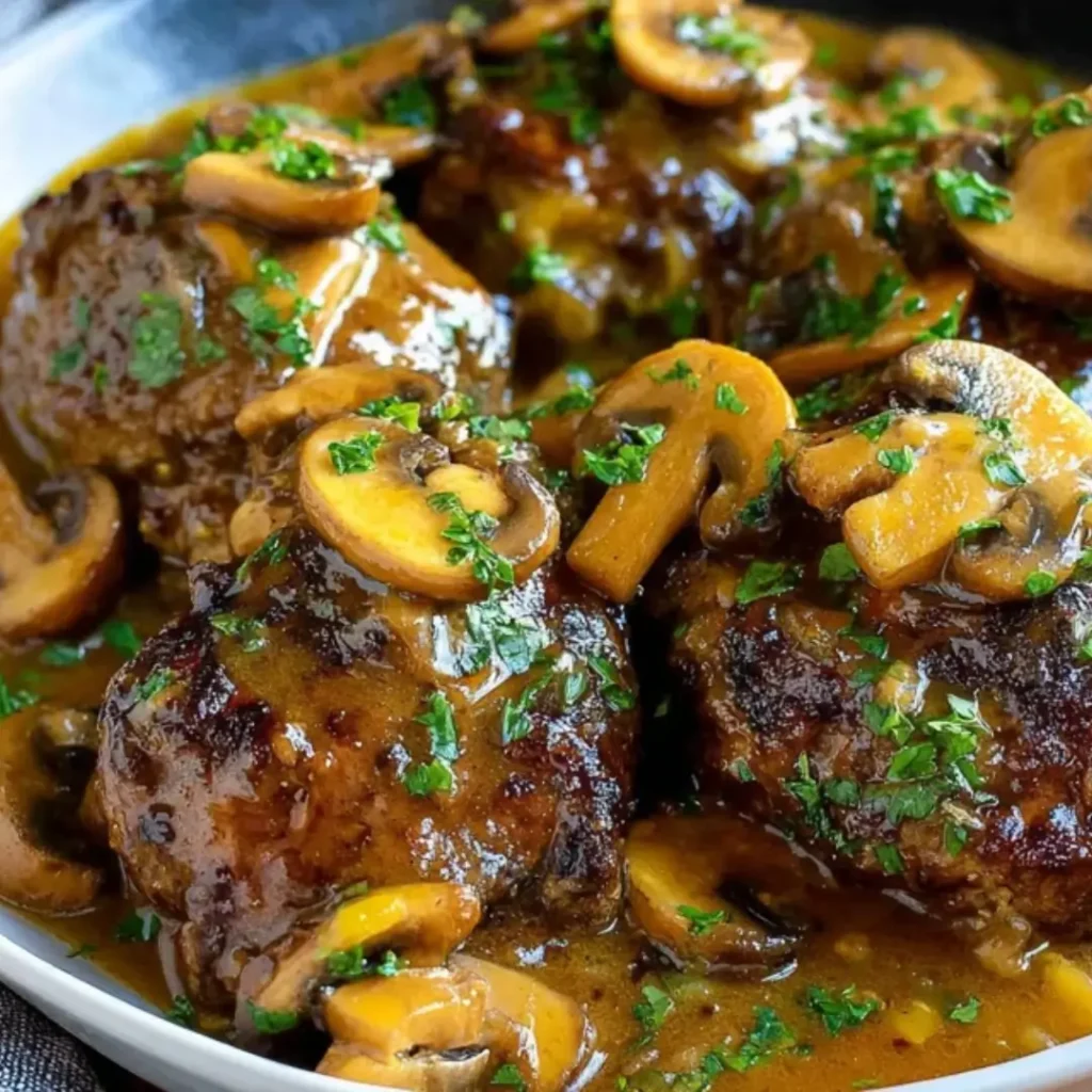 Tender, seasoned ground beef patties pan-fried to perfection and smothered in a rich, savory mushroom and onion gravy, making for a comforting and satisfying meal that’s perfect any night of the week.