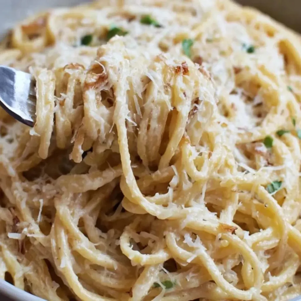 A rich and cozy pasta dish inspired by the flavors of French onion soup — caramelized onions, browned butter, herbs, and melty cheese wrapped around tender pasta.