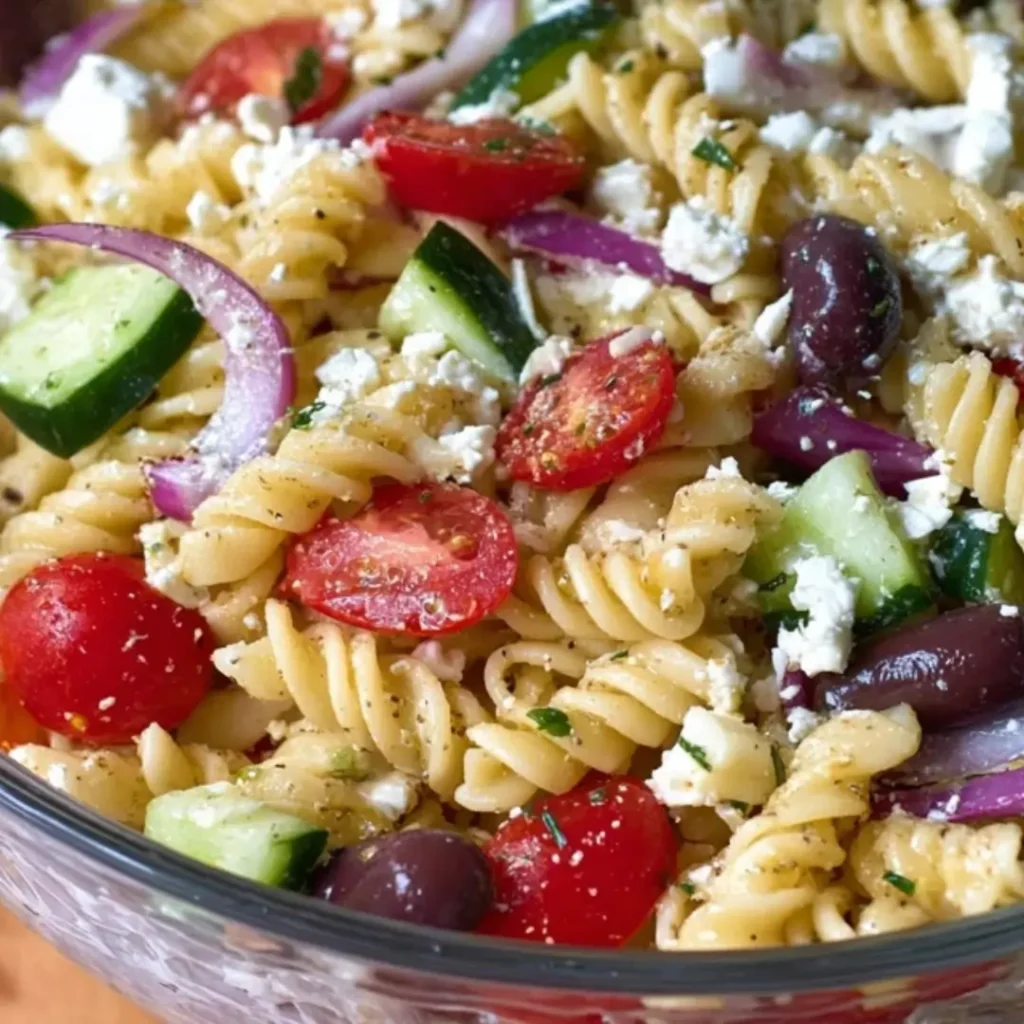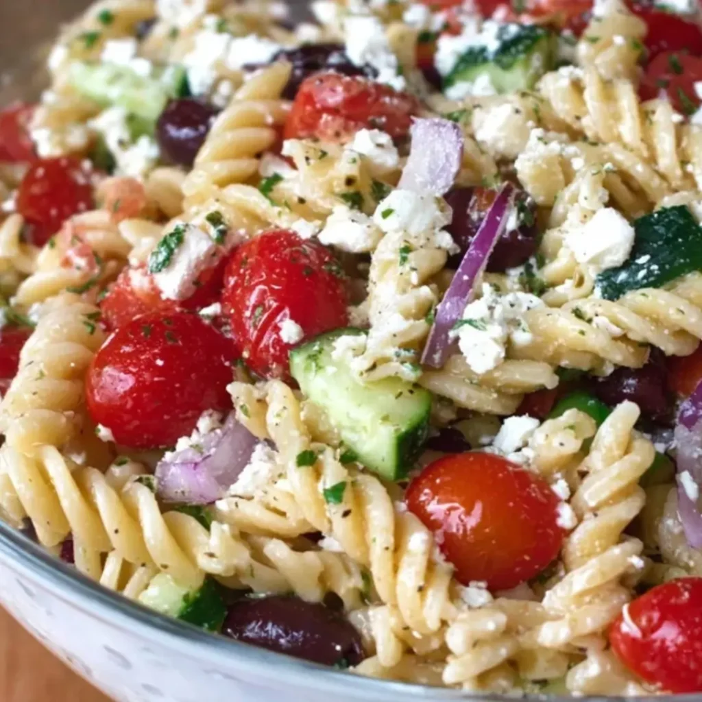 This vibrant Greek pasta salad is bursting with fresh Mediterranean flavors, featuring tender pasta, crisp vegetables, salty feta, and Kalamata olives, all tossed in a zesty lemon-herb vinaigrette. It’s perfect as a side dish, light lunch, or potluck contribution.