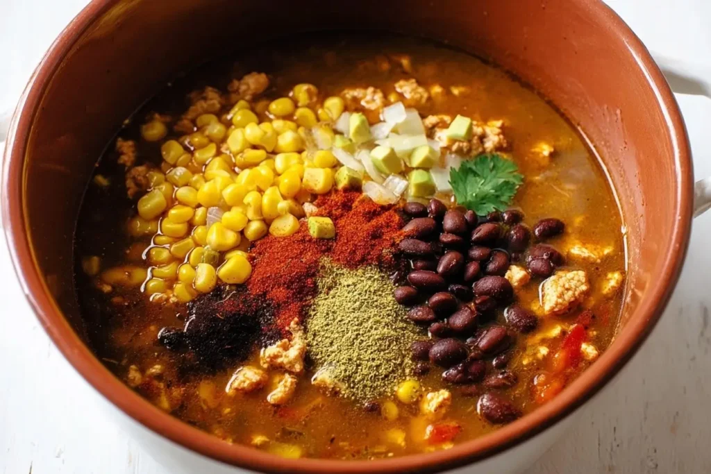 This is where the chili magic happens! Pour in the kidney beans, black beans, diced tomatoes, tomato sauce, chicken broth, and corn kernels. Give it a good, satisfying stir.