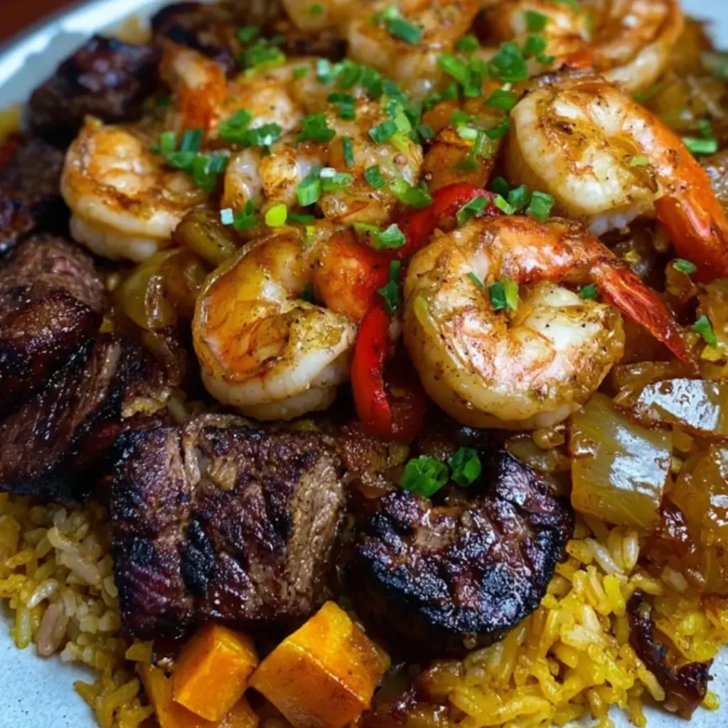 A bold and flavorful Caribbean-inspired dish pairing spicy jerk steak and shrimp with fragrant tropical coconut rice.