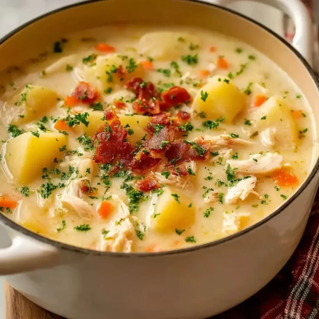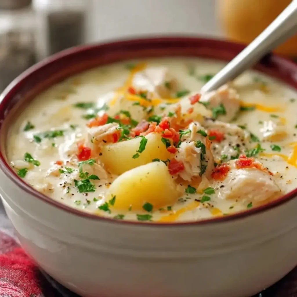 3. Can I make this soup in a slow cooker? Yes! You can add the broth, potatoes, and spices to a slow cooker and cook on low for 6–8 hours. Stir in the cream, cheese, cooked chicken, and bacon during the last 30 minutes of cooking.