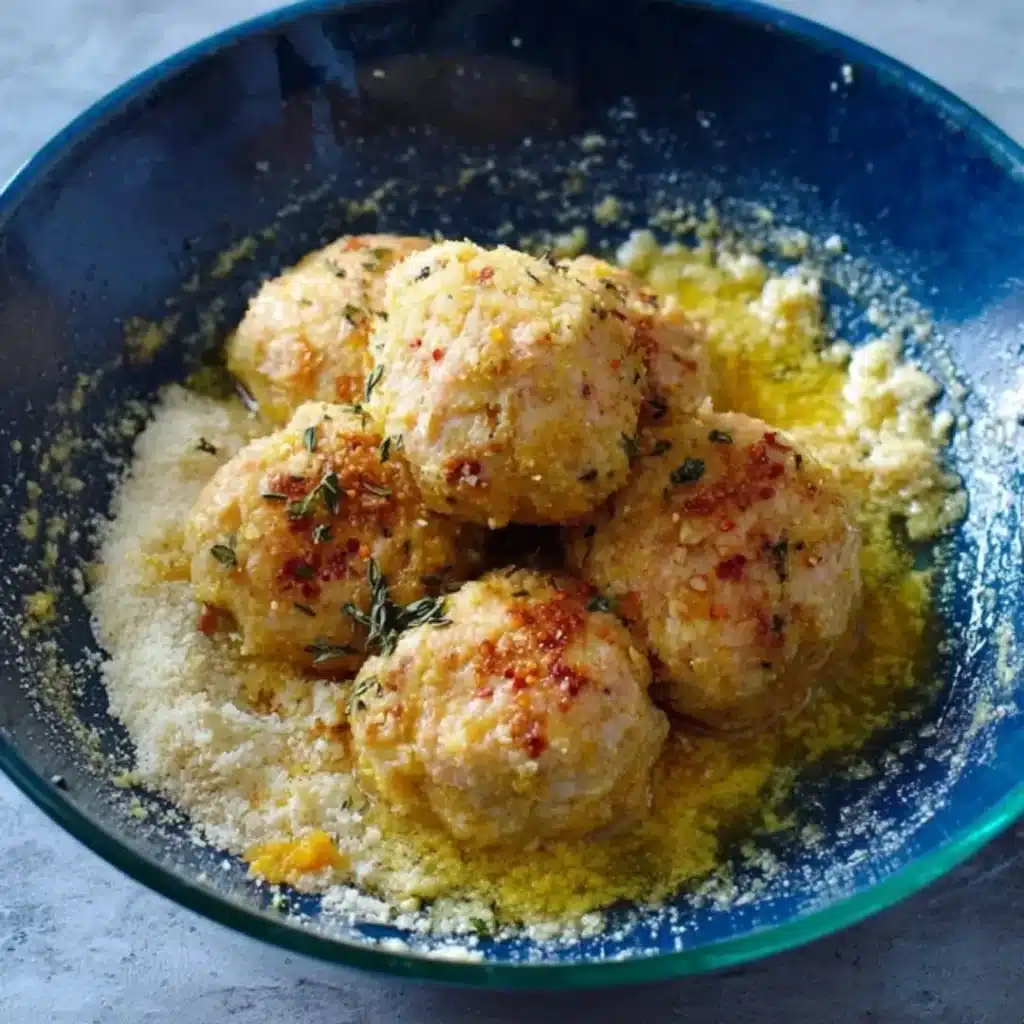 In a large bowl, combine your ground chicken, breadcrumbs, the first portion of Parmesan cheese, egg, minced garlic, and all the dry seasonings (onion powder, oregano, paprika, salt, and pepper). Get in there with your hands and mix everything just until it’s combined—be careful not to overmix, or the meatballs can get tough!