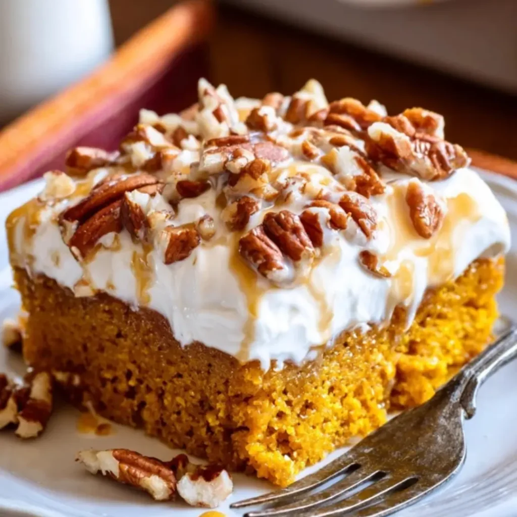 Once the cake is totally cool, gently spread that heavenly whipped cream evenly over the top. Finish it off with a dusting of cinnamon and a sprinkle of crushed pecans for a little texture contrast, if you’re feeling fancy!