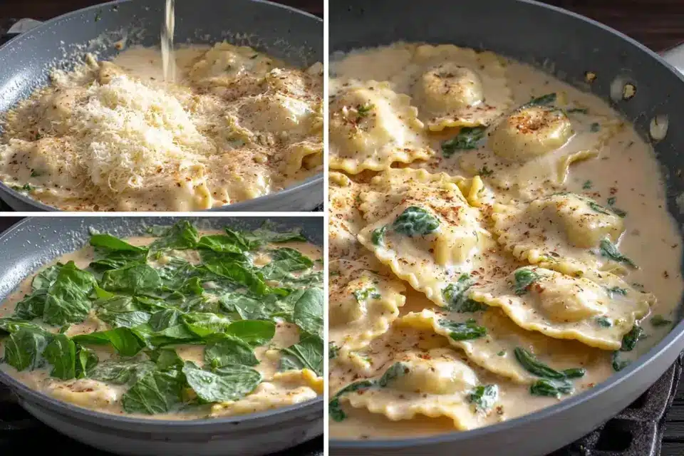 Gently add your cooked ravioli into the skillet, tossing them carefully so they’re all bathed in the sauce. Sprinkle in the Parmesan cheese and keep stirring until the sauce thickens up and hugs the ravioli perfectly.