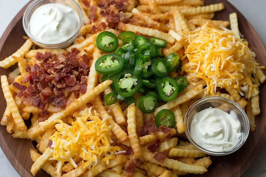 This dish is already vegetarian! To keep it meatless, simply ensure your dipping sauces are vegetarian (like a simple sour cream or plain ranch). If you wanted to add protein for a more complete meal, cooked, crumbled bacon, shredded chicken, or even seasoned ground beef makes a delicious addition scattered over the fries before the final bake.