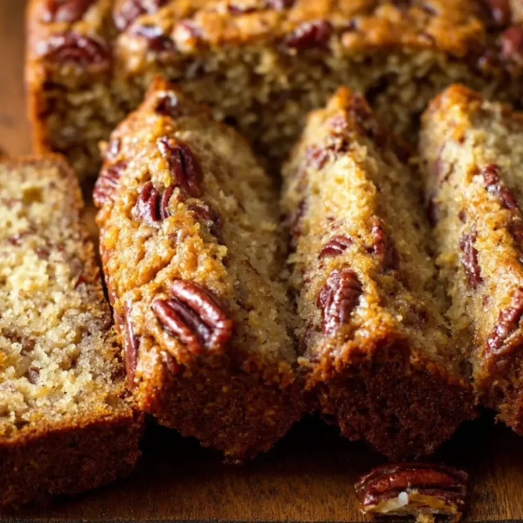 Sliced Sweet Alabama Pecanbread loaf with pecans visible on top, showcasing a moist, golden-brown crumb on a wooden cutting board.